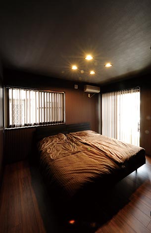 ダークブラウンを基調 としたシックな寝室 照明に映えるストライ プの壁紙がポイント イエタテ